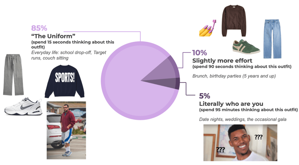 Here is my outfit-on-autopilot formula (developed during a shower, so you know it’s brilliant). If I wear something 85% of the time, I spend 15 seconds thinking about it. This means I’m wearing some combination of sweatpants, an XL top, and whatever sneakers I can find. And between you and me, sometimes a bra is optional.